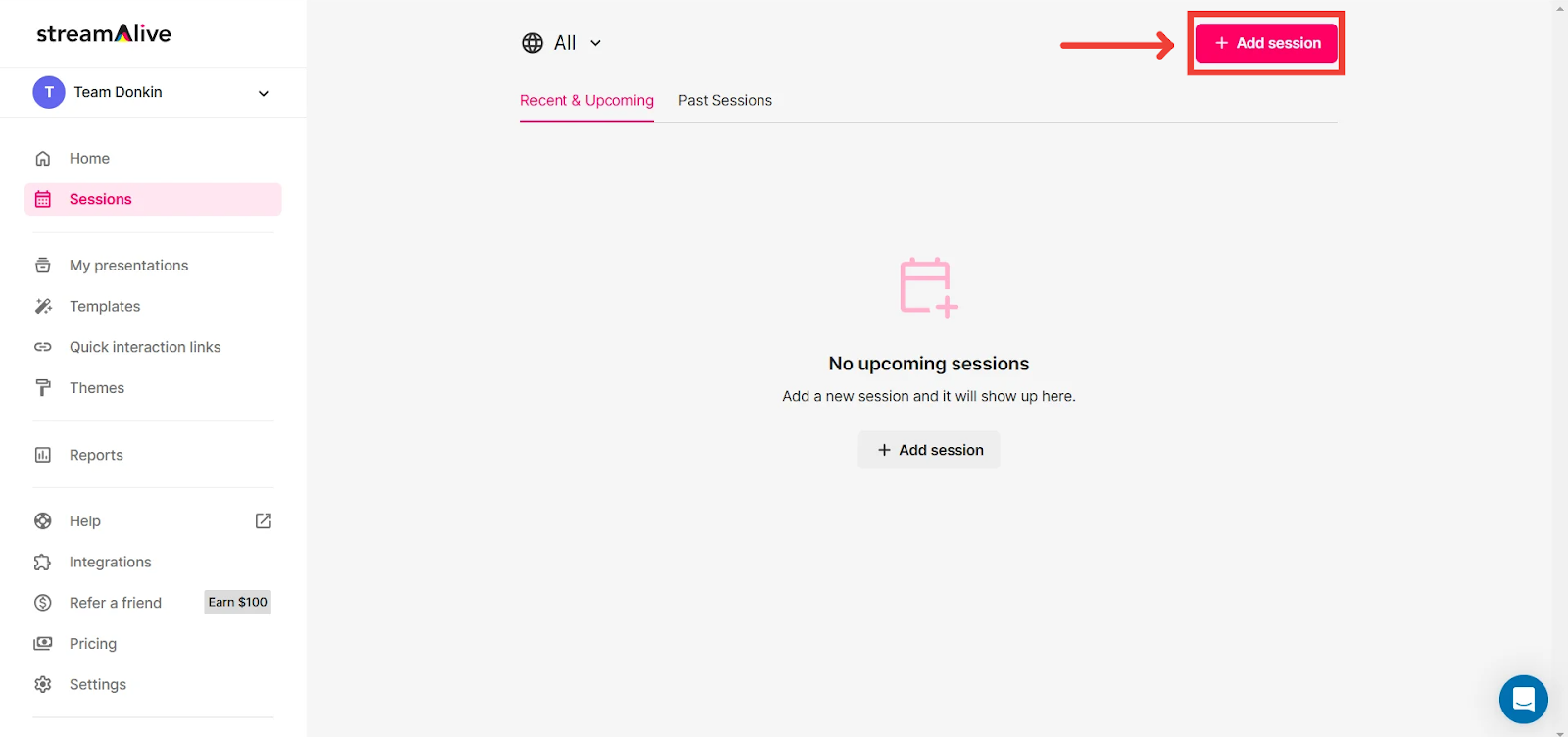Click on the “+ Add session” button in the top-right corner of the page to schedule a meeting.