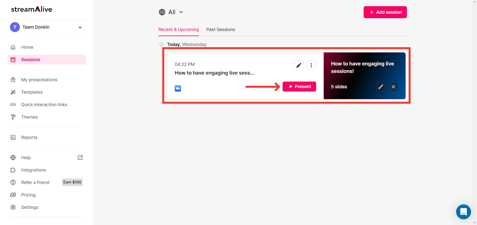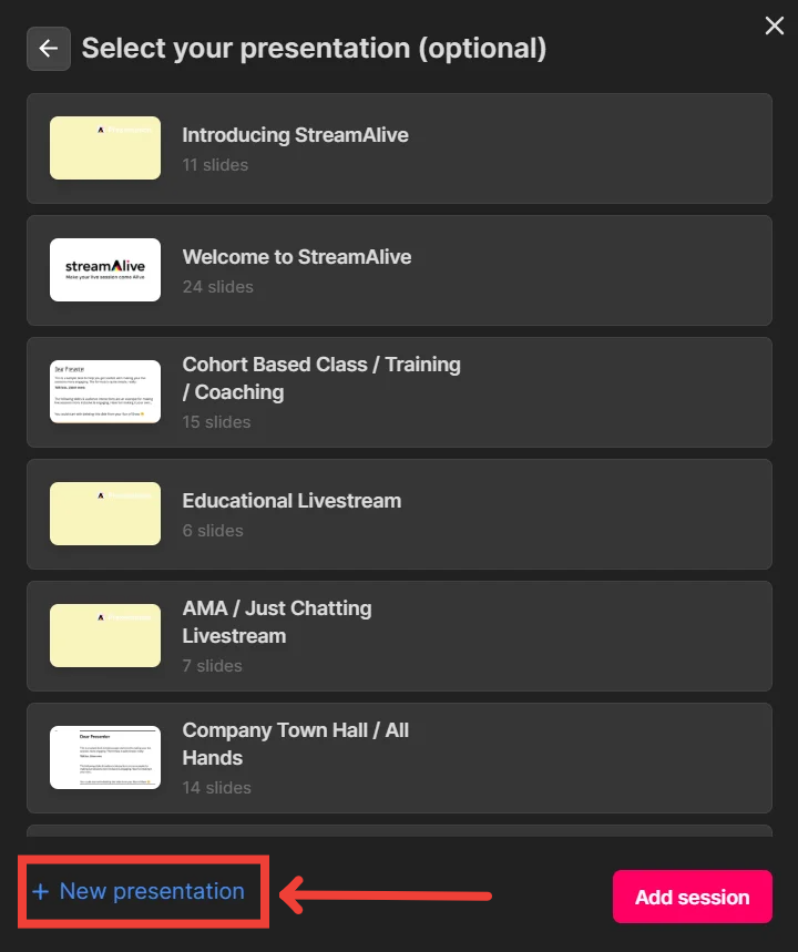 2. If you want to use a presentation to plan your interactions and slides in advance, you can create a presentation by clicking on the + New presentation button on the bottom left corner of the pop-up. Now, once selected, click on Add session.
