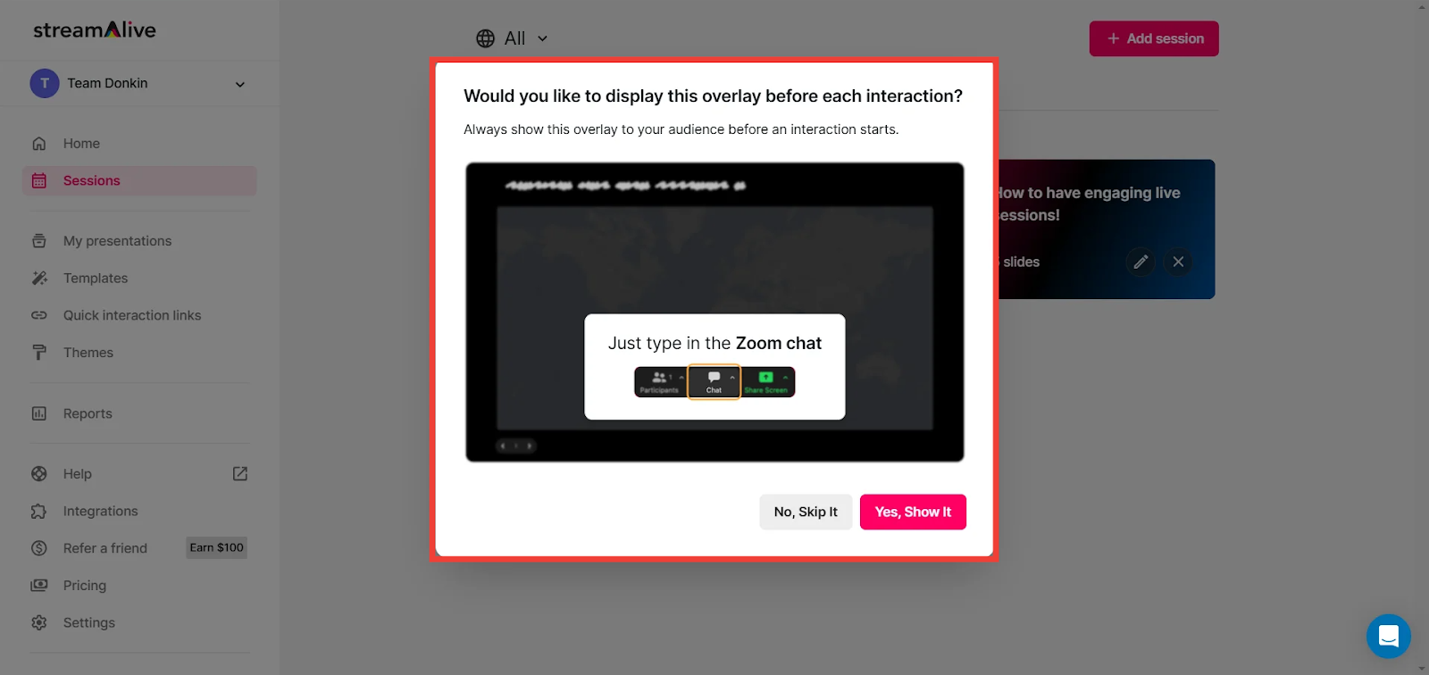 8. A pop-up will appear asking if you want to display an overlay asking your audience to type the answers in the chat. Typing in the chat to interact with a poll or word cloud is such a new experience for many audience members that they need a prompt or push to “put it in the chat!”.