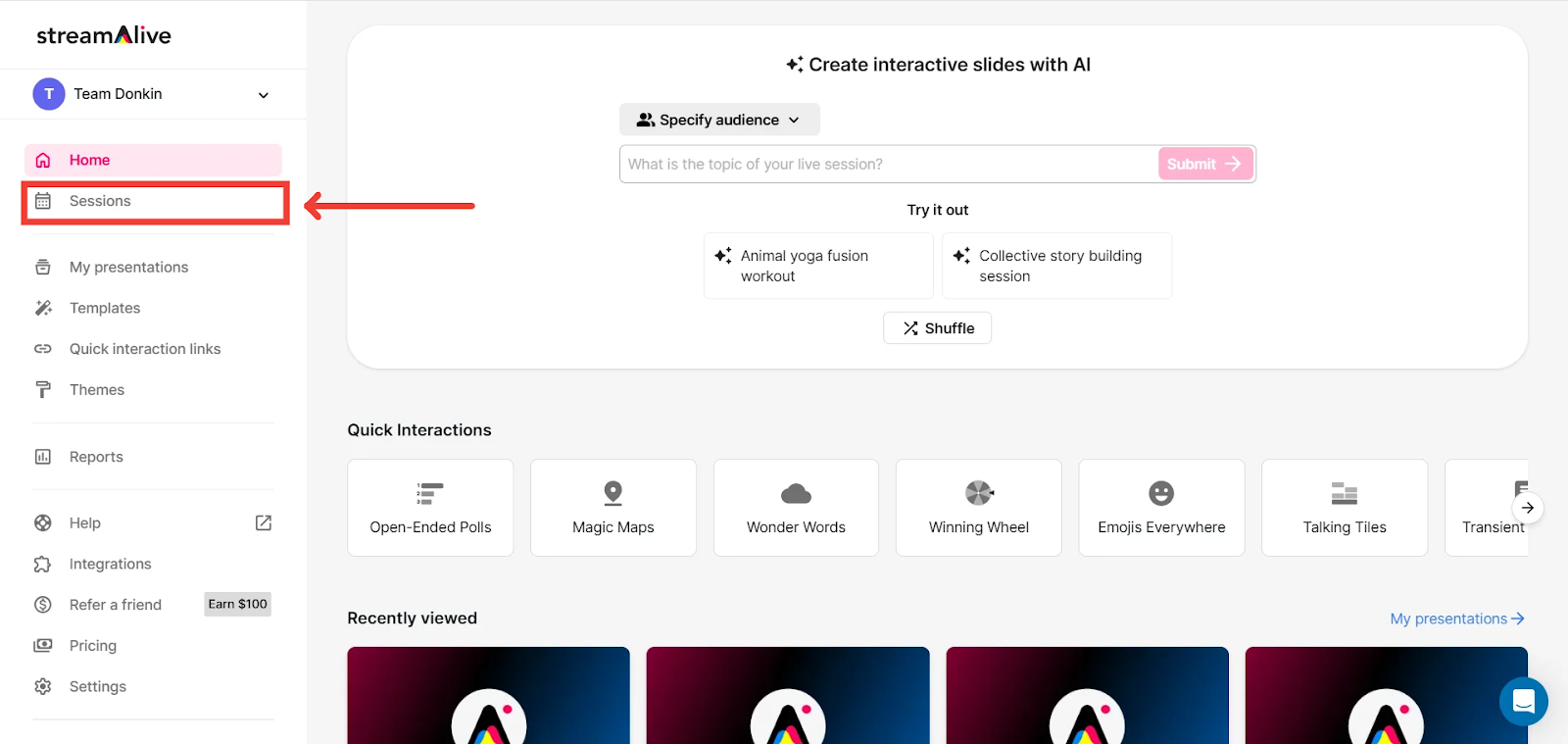 1. On the homepage, click on the “Sessions” tab on the left-side menu.