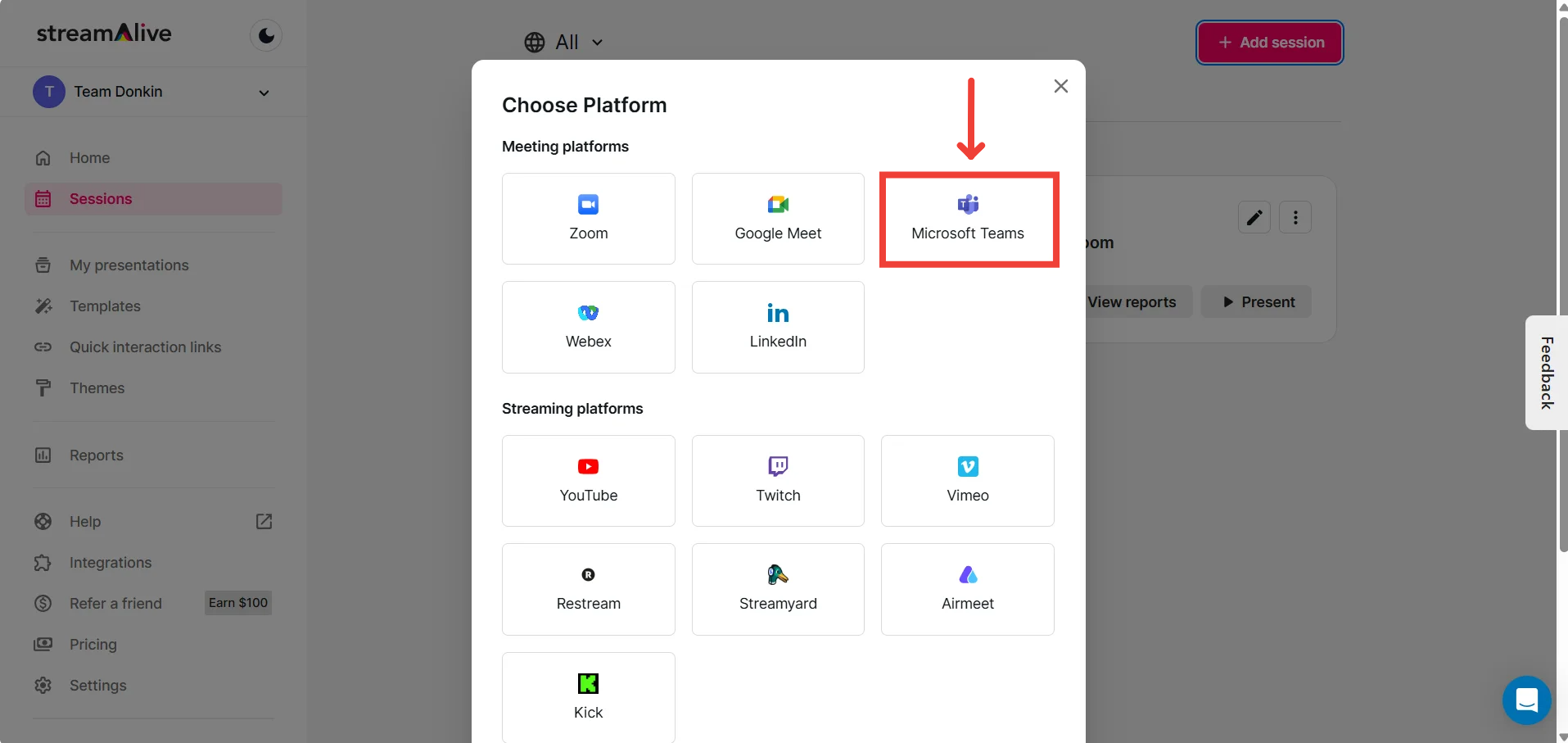 5. Add your StreamAlive presentation to the session. Your StreamAlive presentation contains your polls, word clouds, spinner wheels, and other interactions that are powered through StreamAlive using the chat.